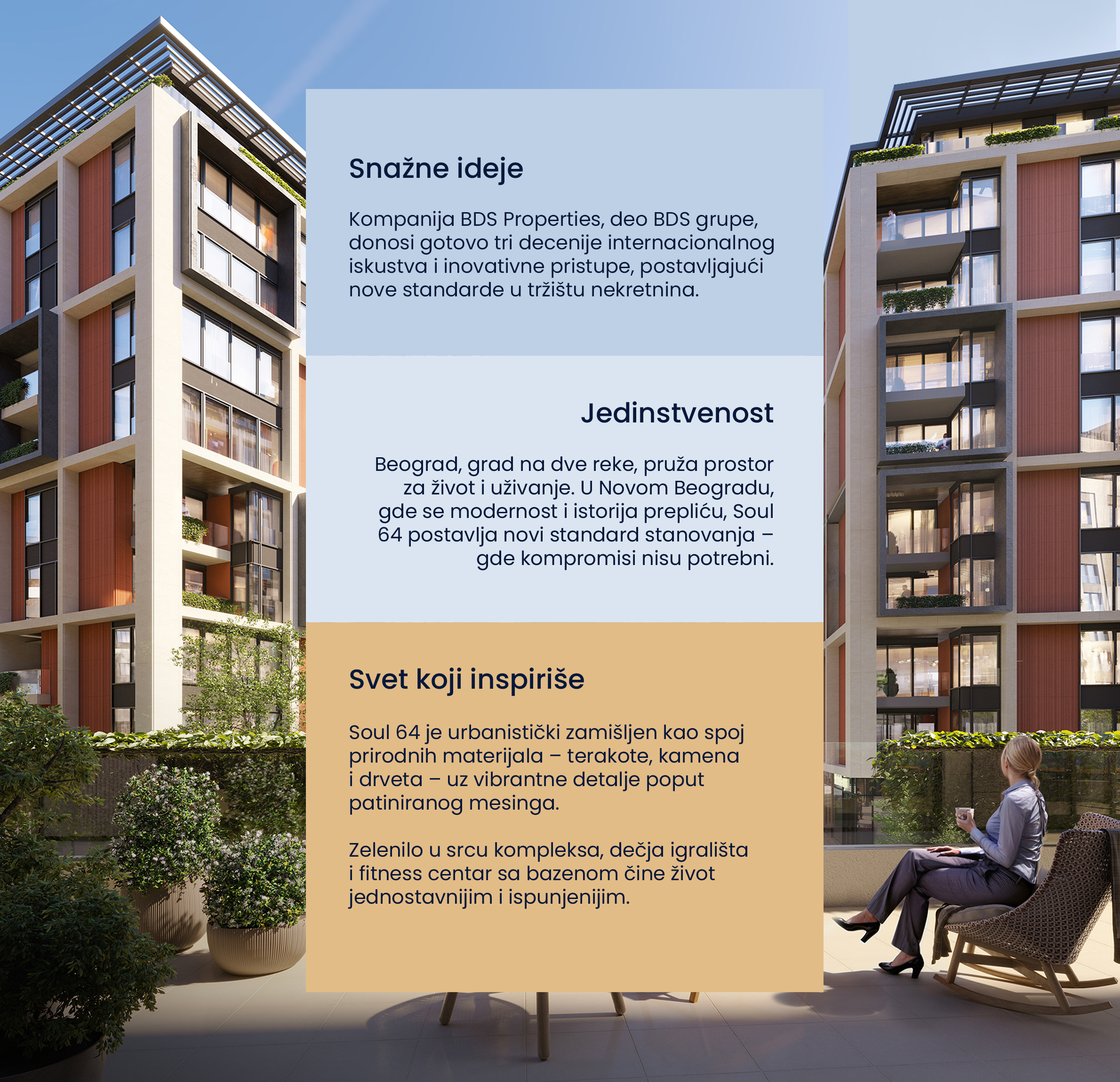 Soul 64 je jedinstveni kompleks u srcu Novog Beograda, sa centralnom lokacijom uz biznis zonu i reku, okružen zelenilom. Luksuzan u prirodi, prepoznatljiv po vrhunskoj materijalizaciji i - ima dušu.